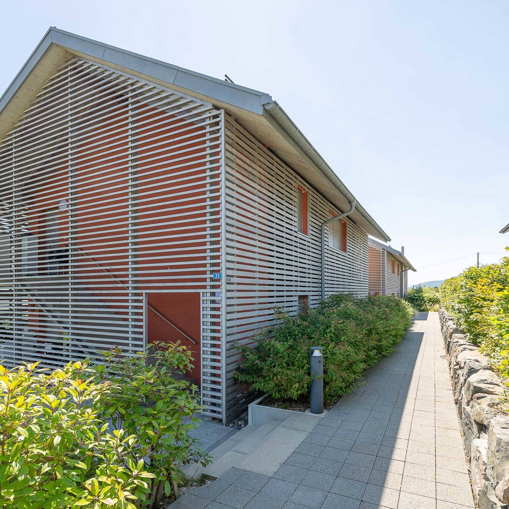 Entre manège hippique et villas, les trois bâtiments s’orientent vers le sud-ouest, perpendiculairement à la route. Ces volumes, à mi-chemin entre maisons campagnardes et dépendances rurales, sont organisés le long d’un espace central qui offre une perspective sur l’environnement champêtre du pied du Jura. Cet espace de rencontre donne accès à l’ensemble des appartements, ainsi qu’au jardin communautaire. Chacun des bâtiments regroupe un logement par étage donnant un caractère collectif à ces petites maisons villageoises.